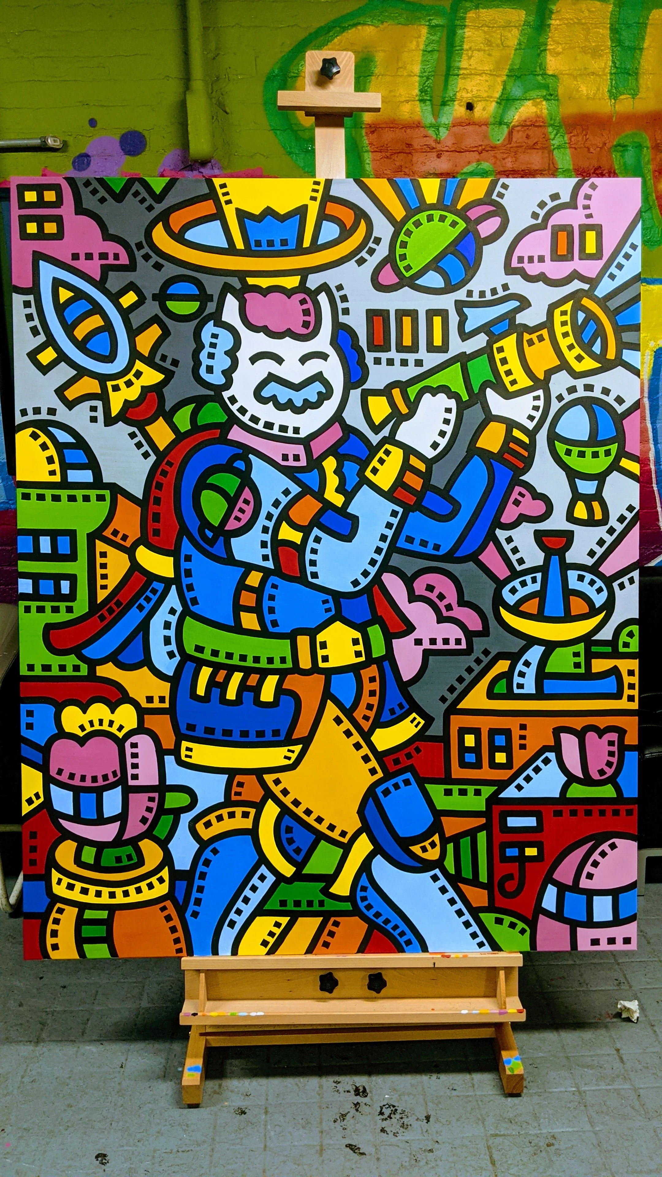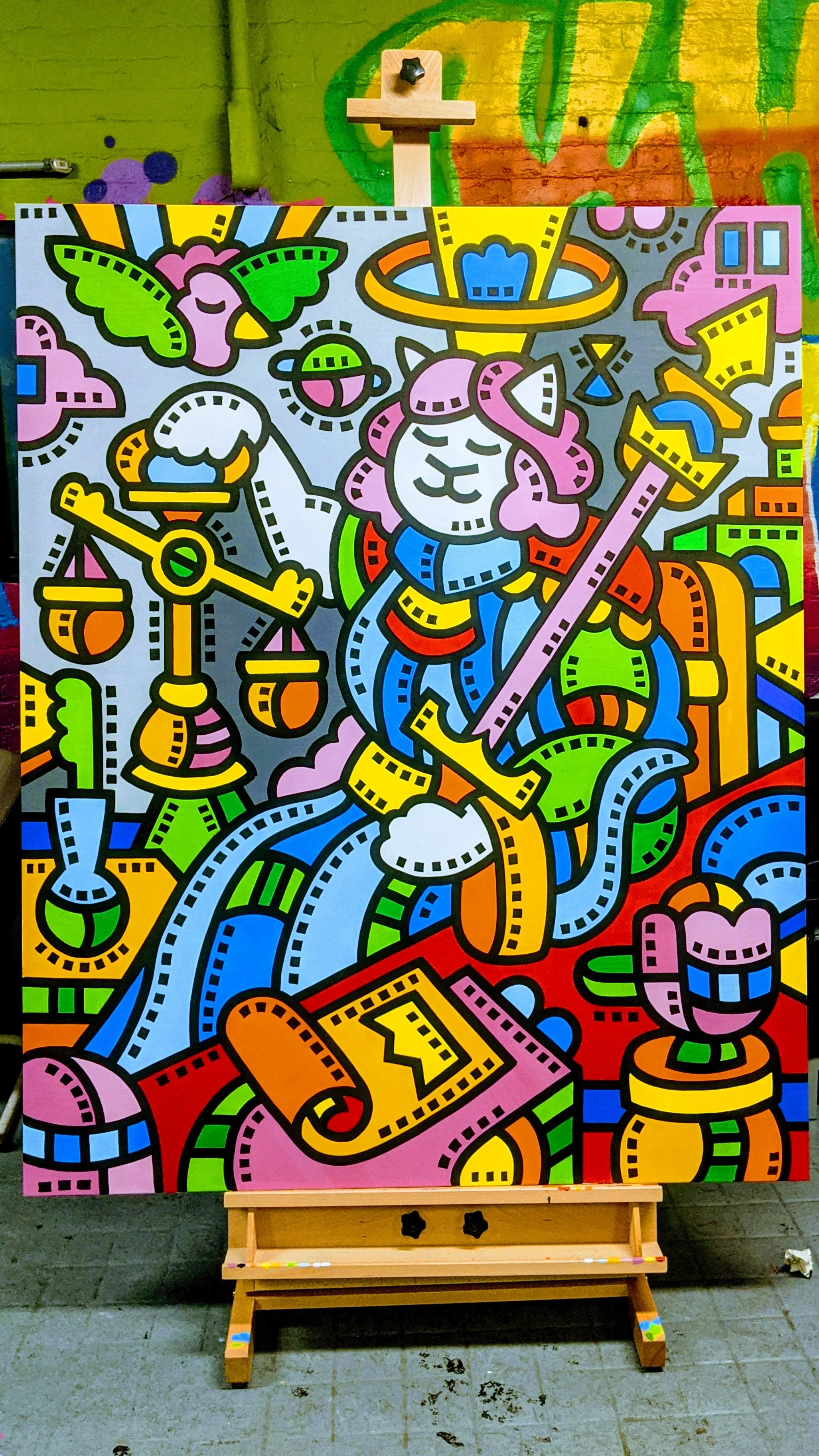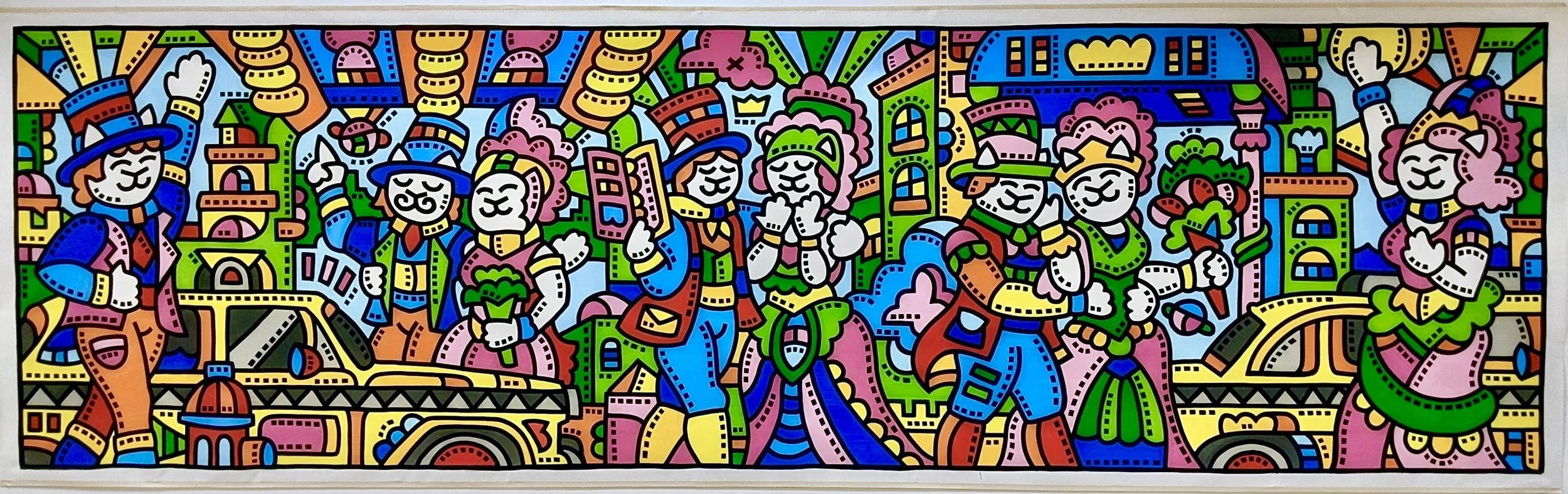 First, Rob begins to create black outlines on an oversized canvas. The scenes he paints are typically improvised and based on local recognizable landmarks which are populated by his Kittizen characters. As he paints, he begins to invite onlookers to fill in each section with color. Rob provides paint markers in over ten colors that guests use to bring life and vibrancy to the illustration. Along the way, Rob shares information on the attributes and techniques on how to master the materials that guests are using. Sometimes, mistakes are made, but it is the nature of the project to allow for these happy mistakes to occur. What matters most is that everyone keeps going! Once participation is over, guests are given signed Official Kittizen Muralist certificates in honor of collaborating together. Over 1000 people have participated in murals across New York, California, New Jersey, Florida, and Hungary.